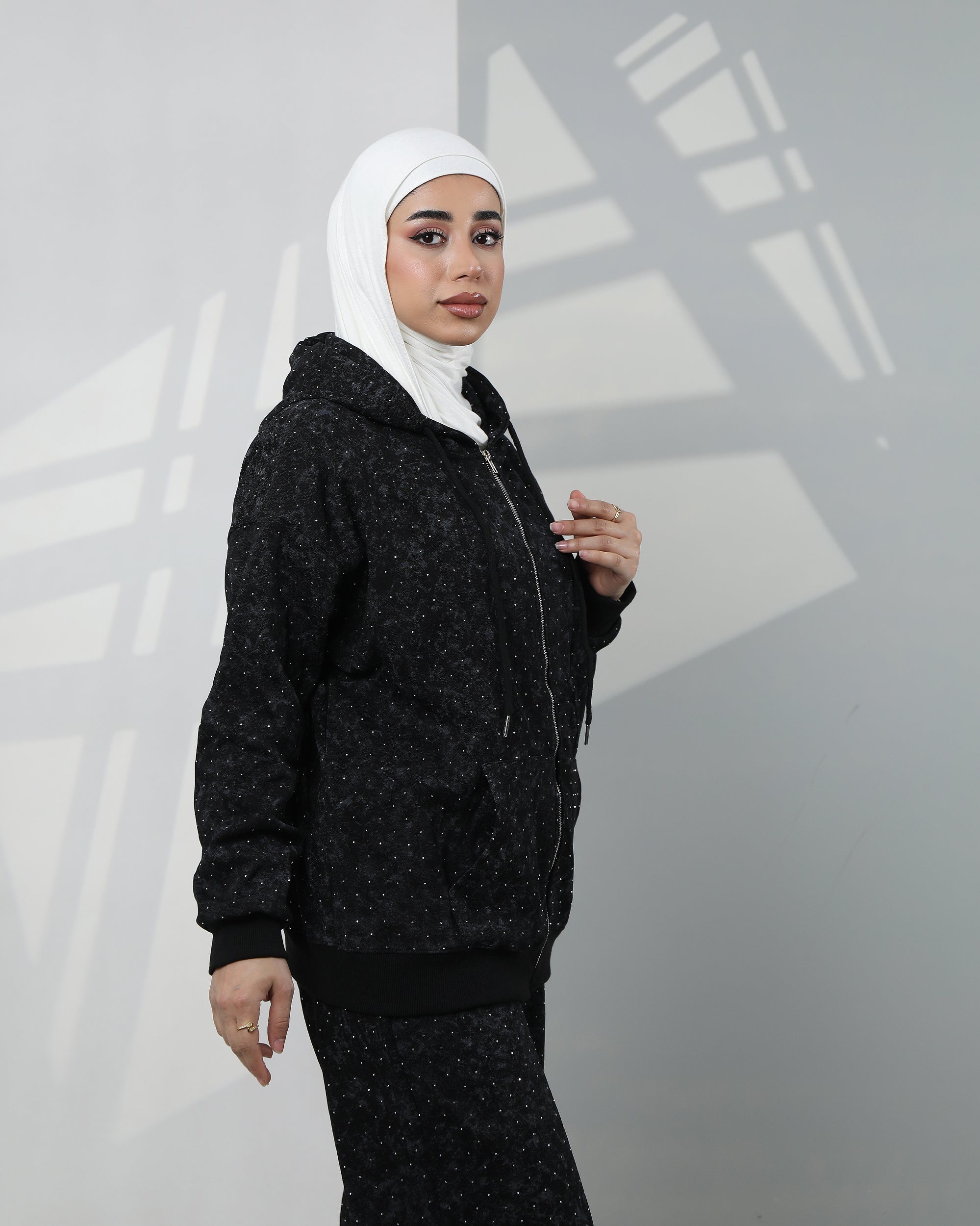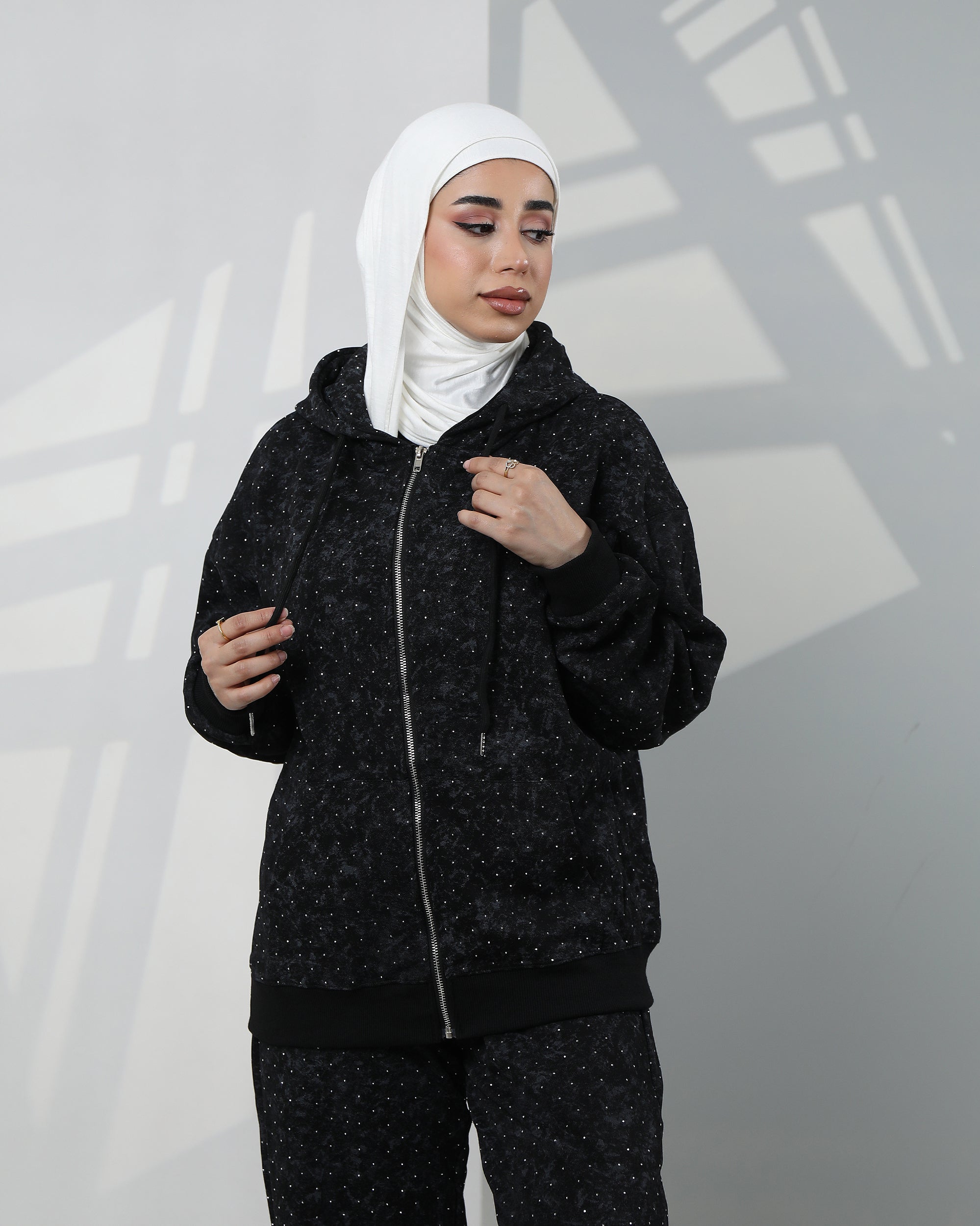• بلوزة بغطاء رأس بسحاب مع تفاصيل مرقطة خفيفة