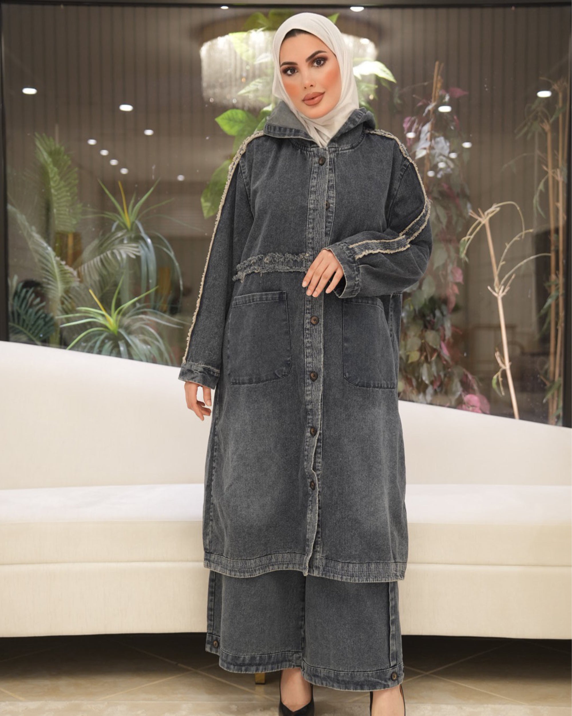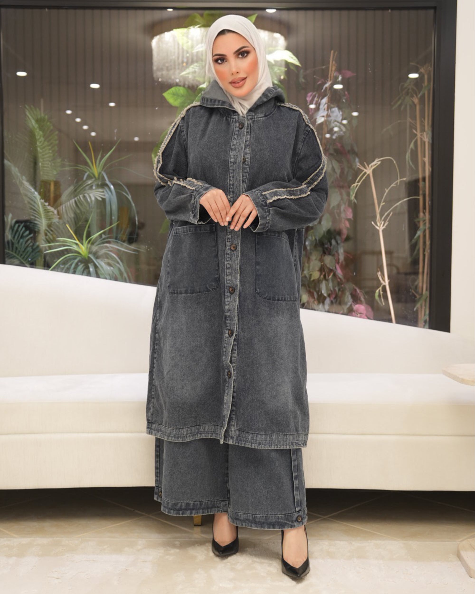 طقم مكون من قطعتين مصمم من دنيم تينسل الناعم، مصمم لهيكل مريح وارتداء يومي.