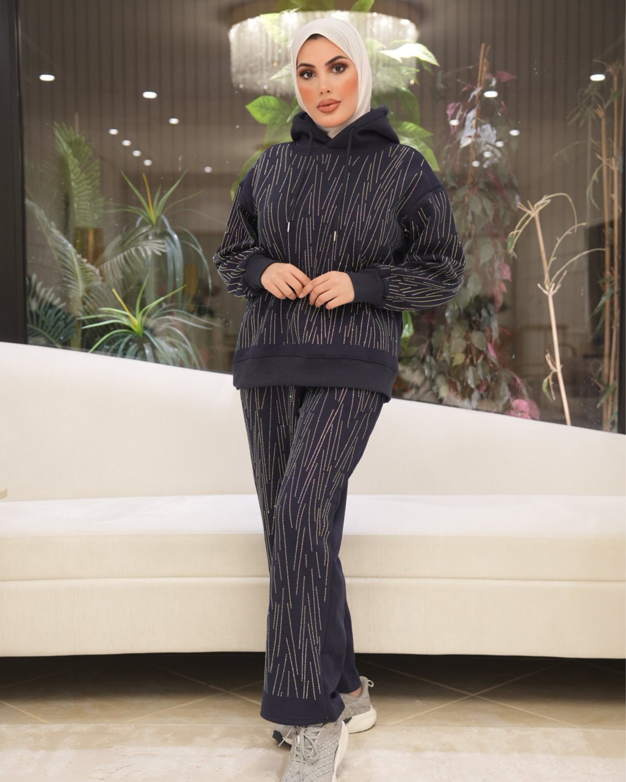 Printed Velvet Hoodie Two-Piece Set – Navy Blue