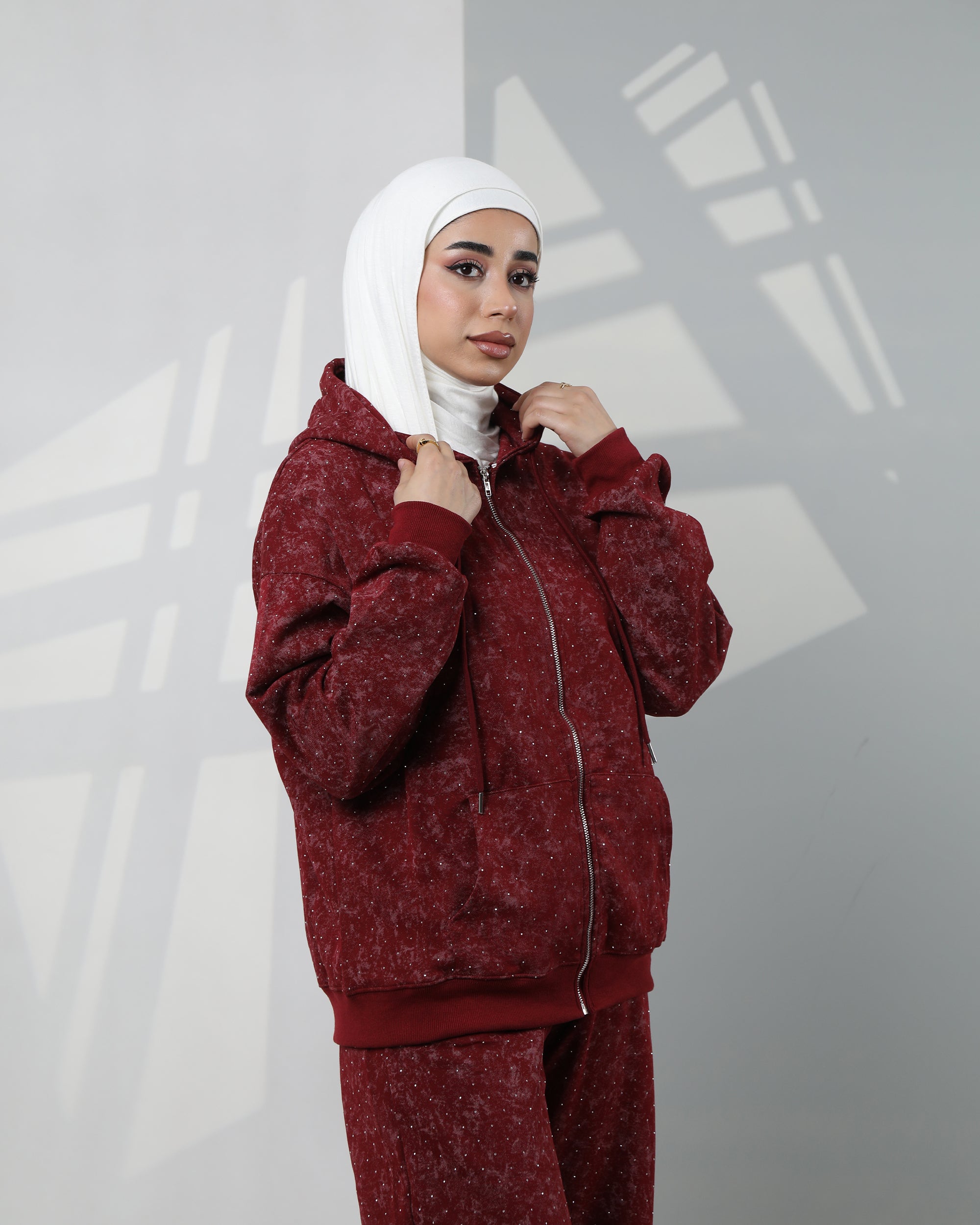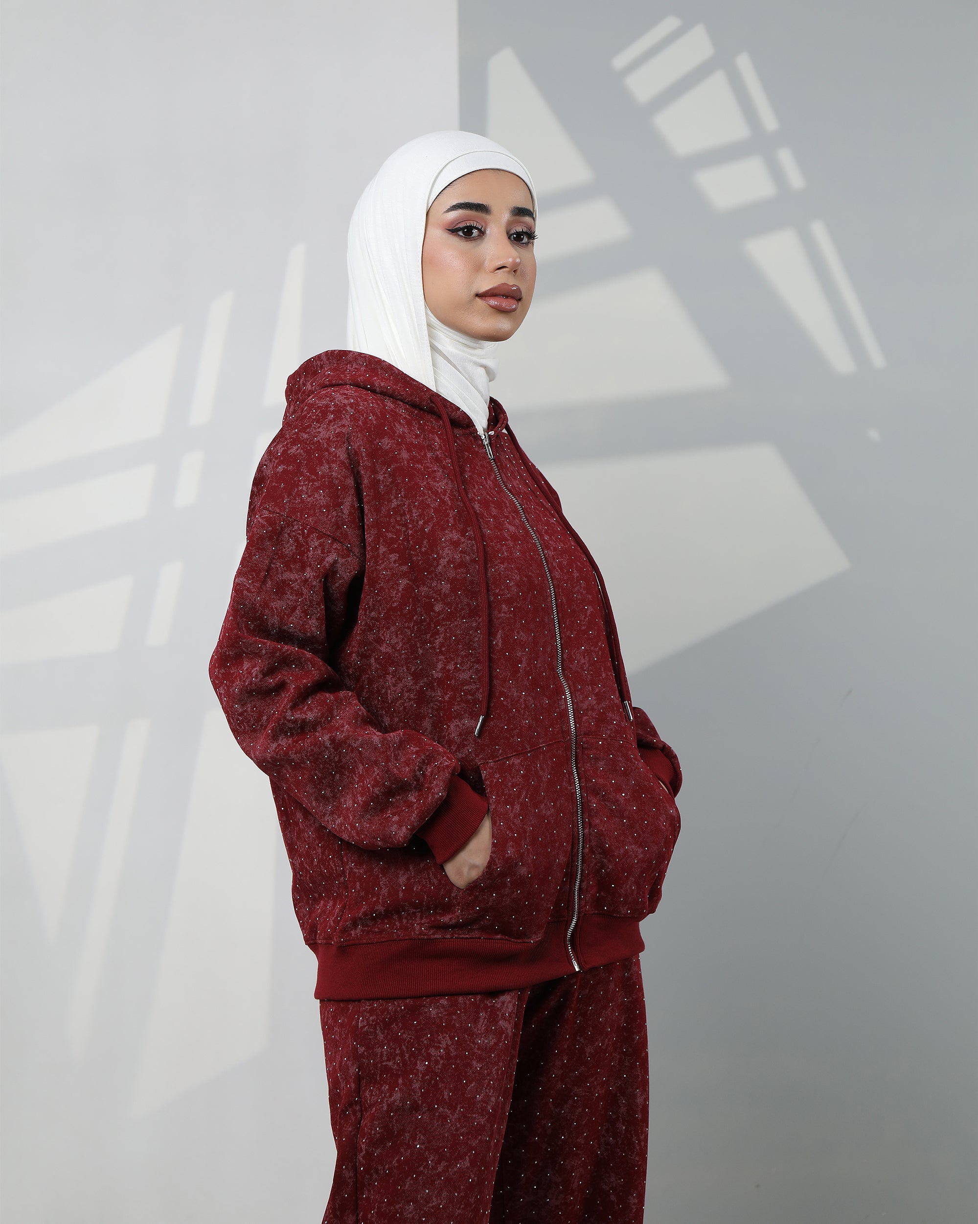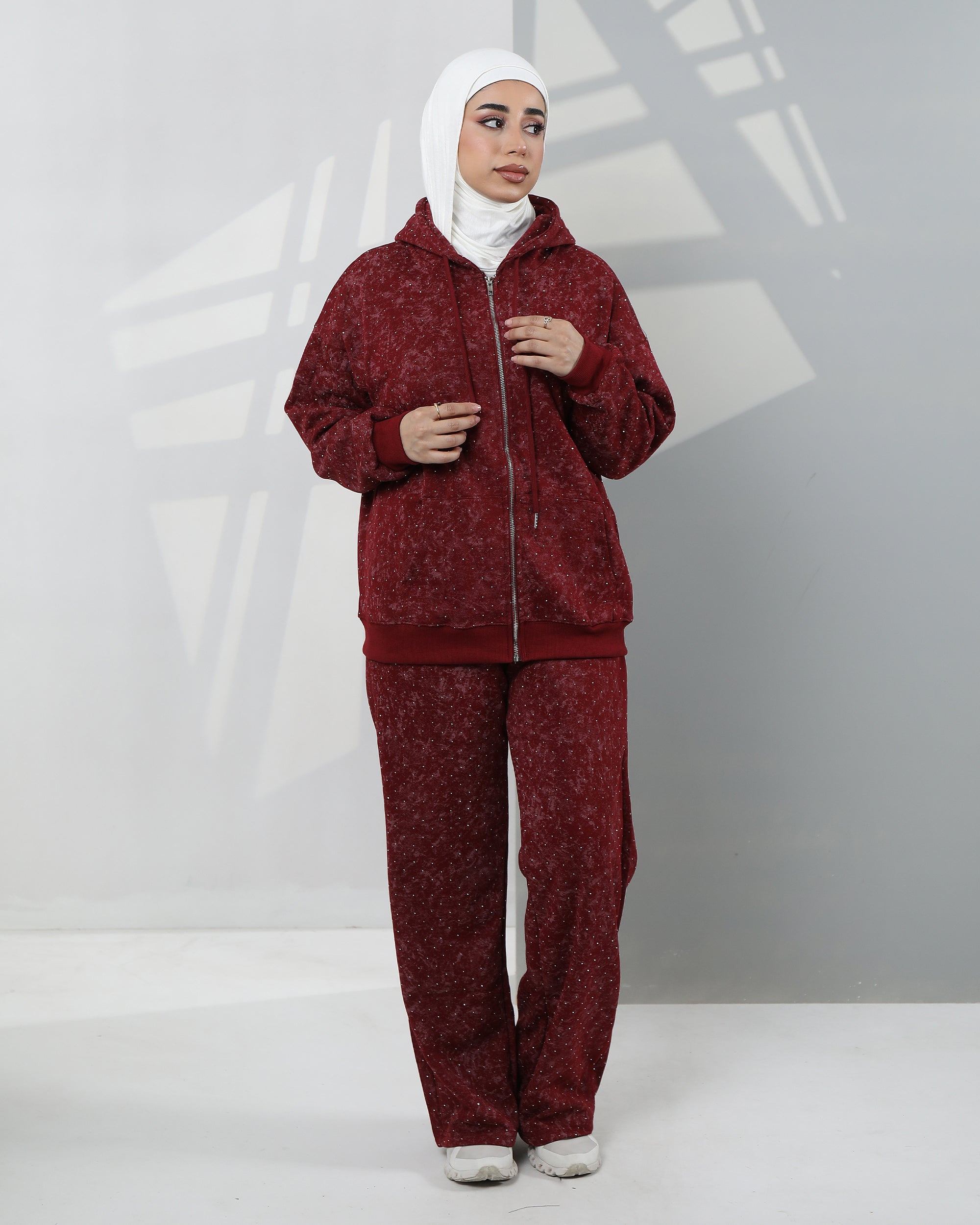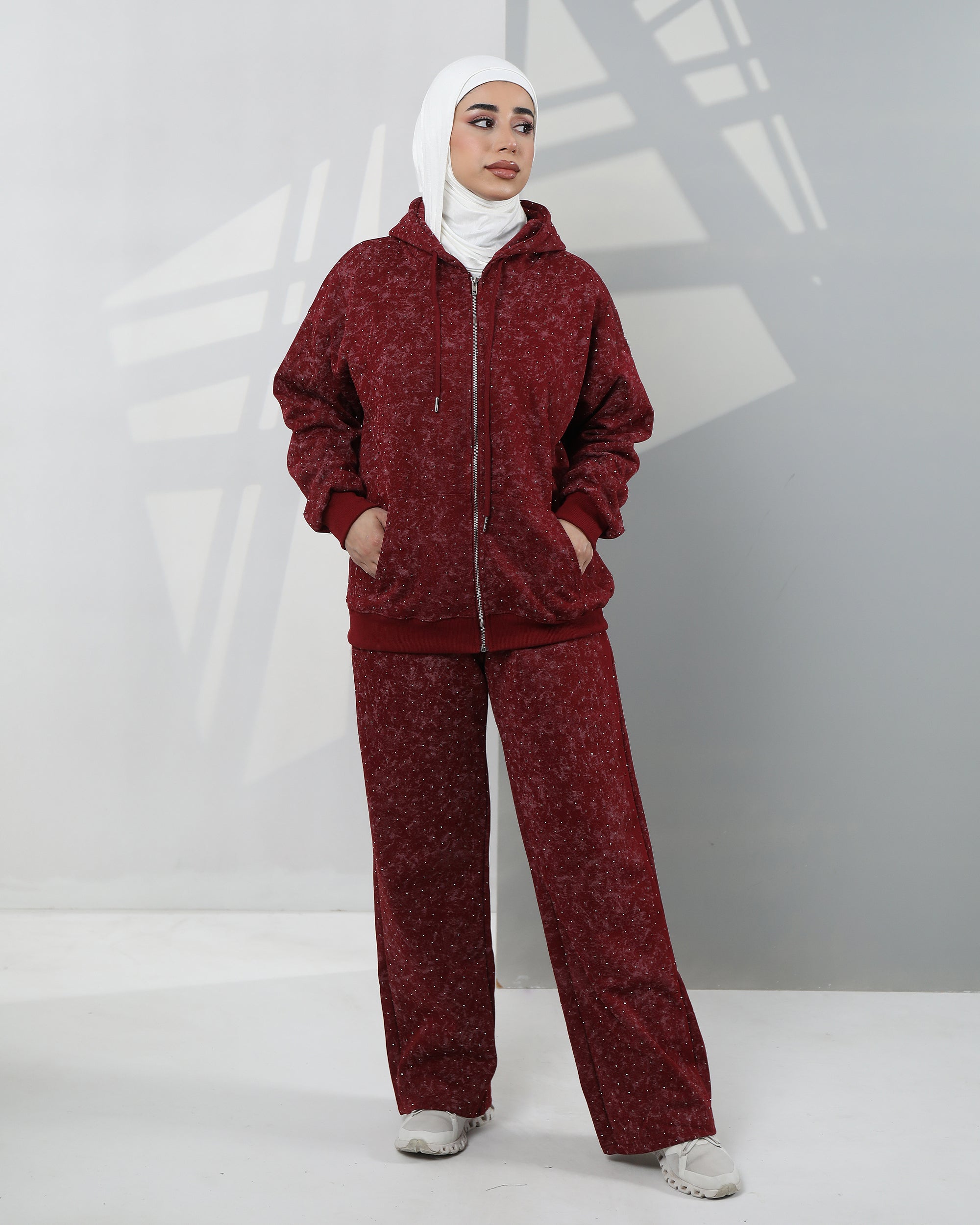 Embellished Velvet Hoodie Two-Piece Set – Deep Burgundy