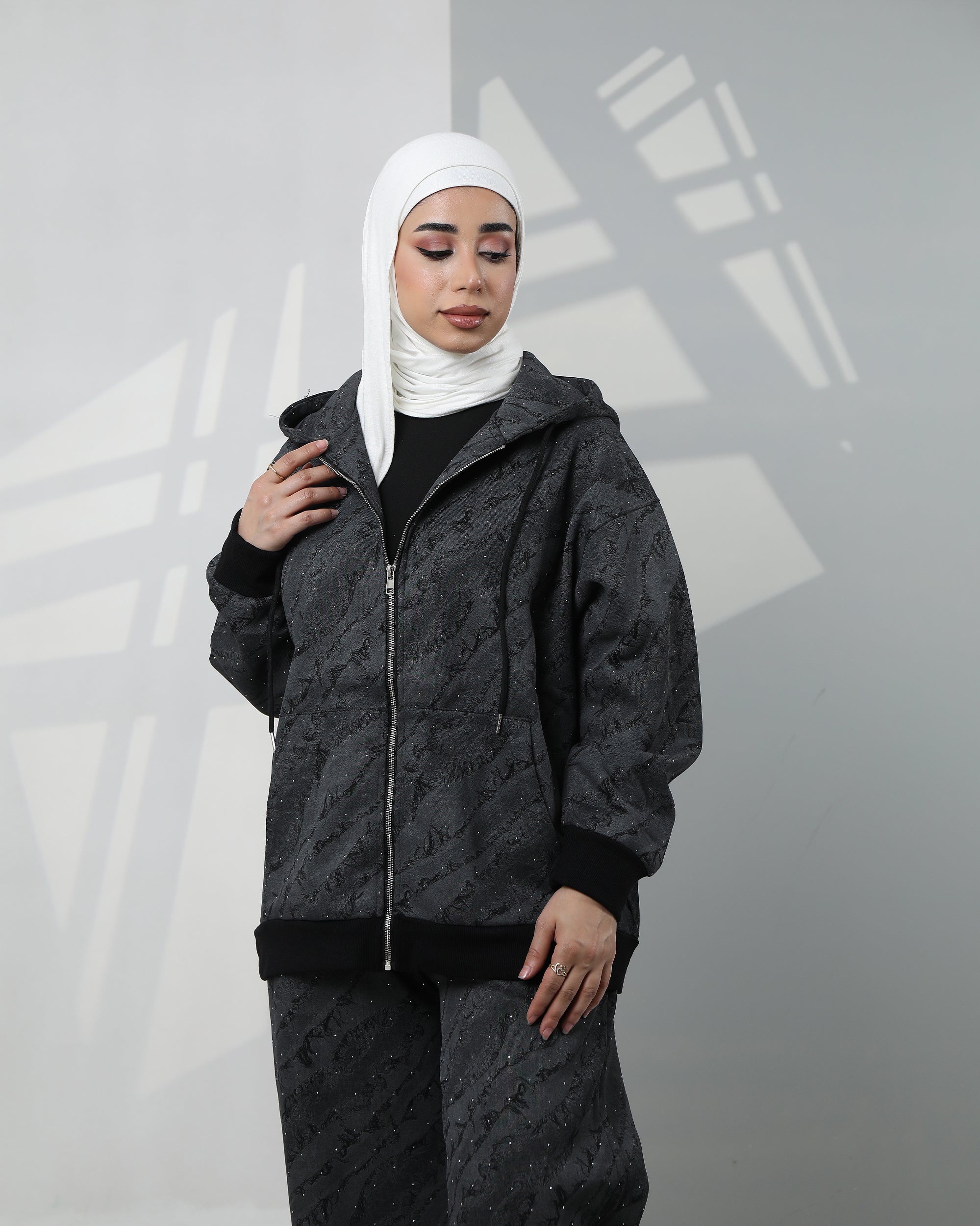 Printed Velvet Hoodie Two-Piece Set – Dark Grey