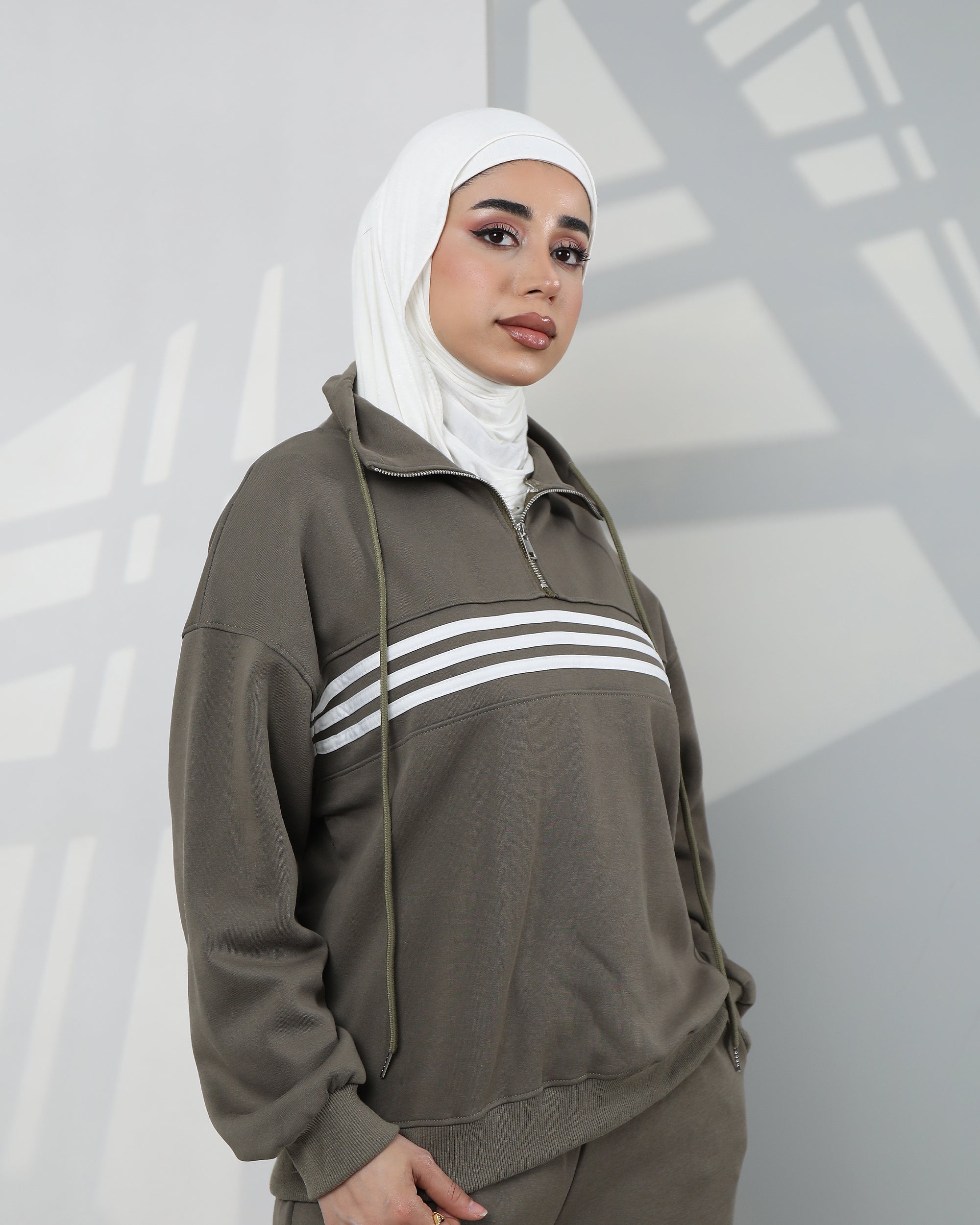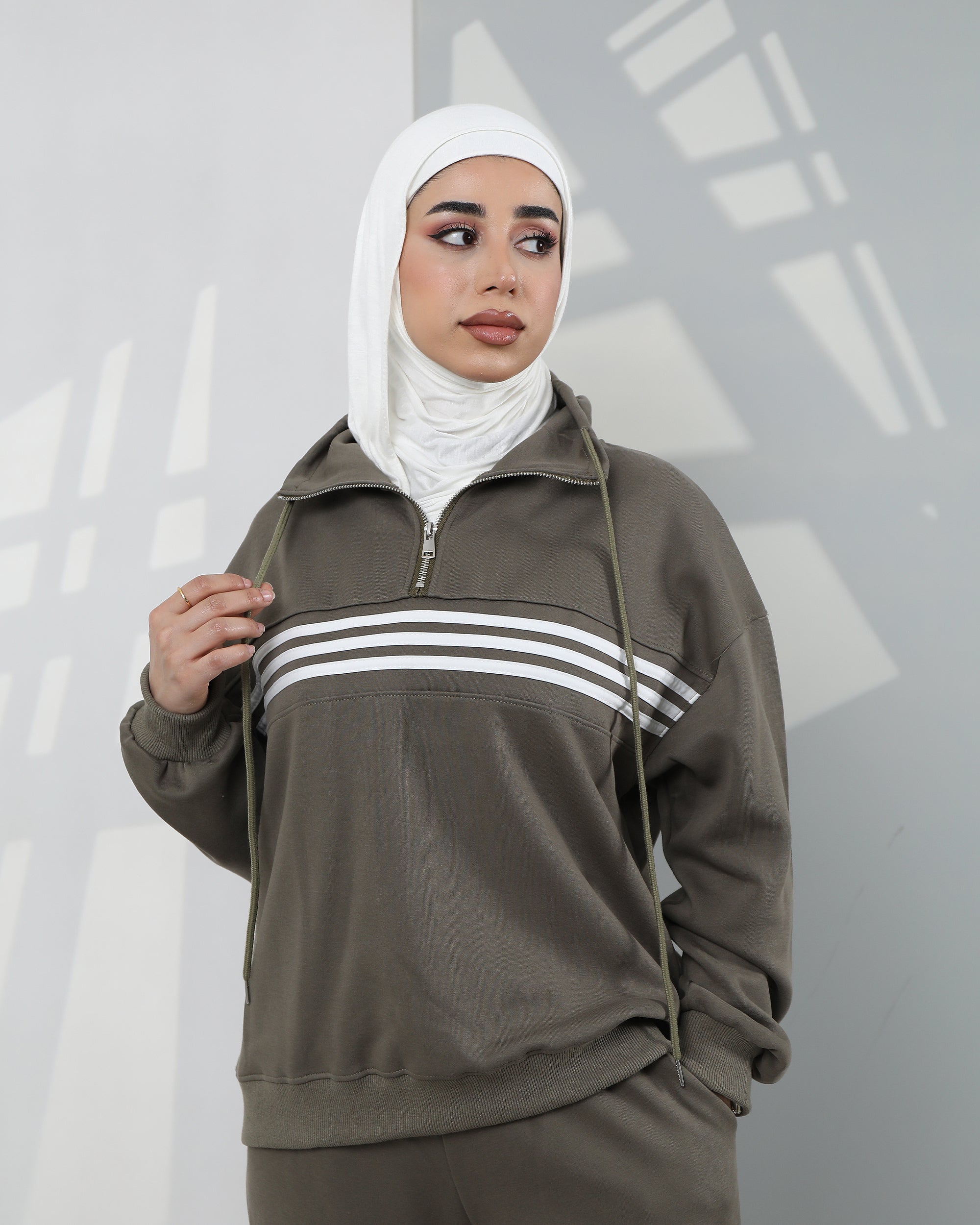 Striped Velvet Half-Zip Hoodie Two-Piece Set – Olive Green