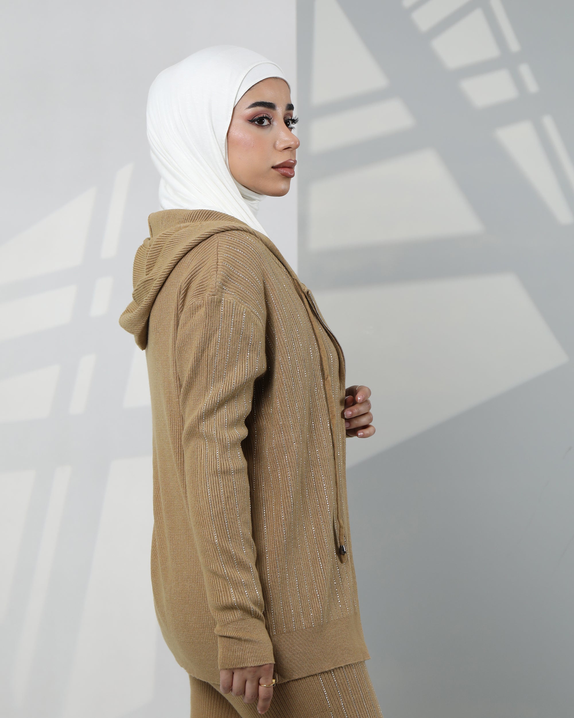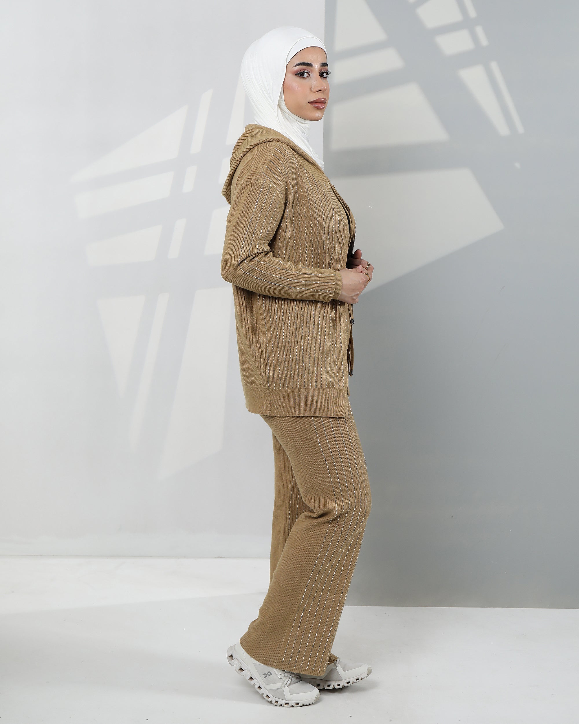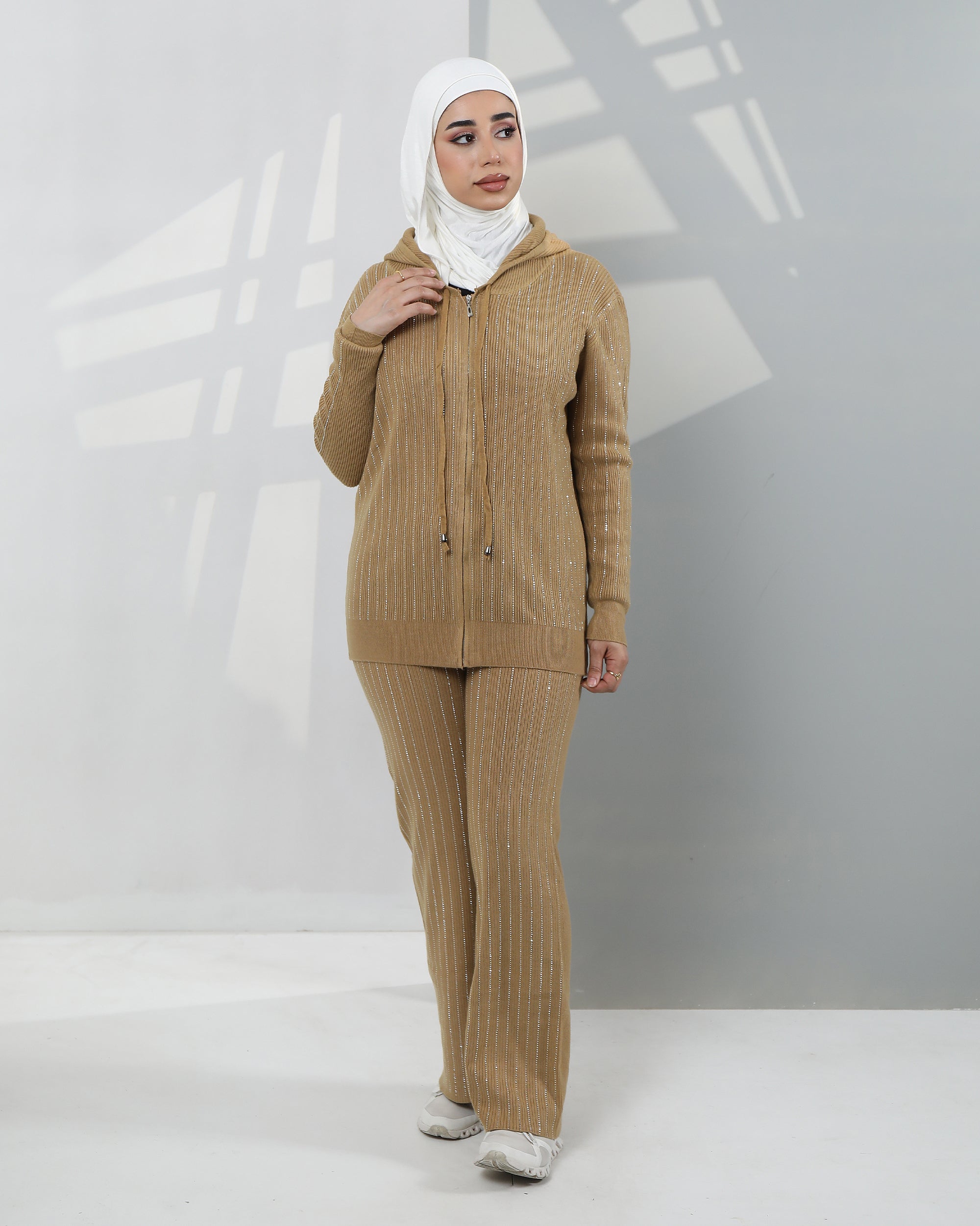 Striped Velvet Zip-Up Hoodie Two-Piece Set – Camel Beige