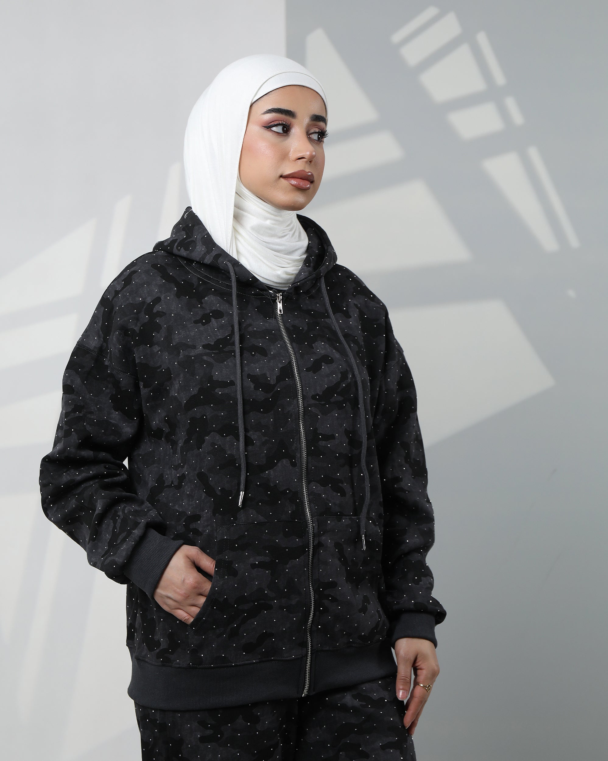 • Zip-up hooded top with all-over camo print