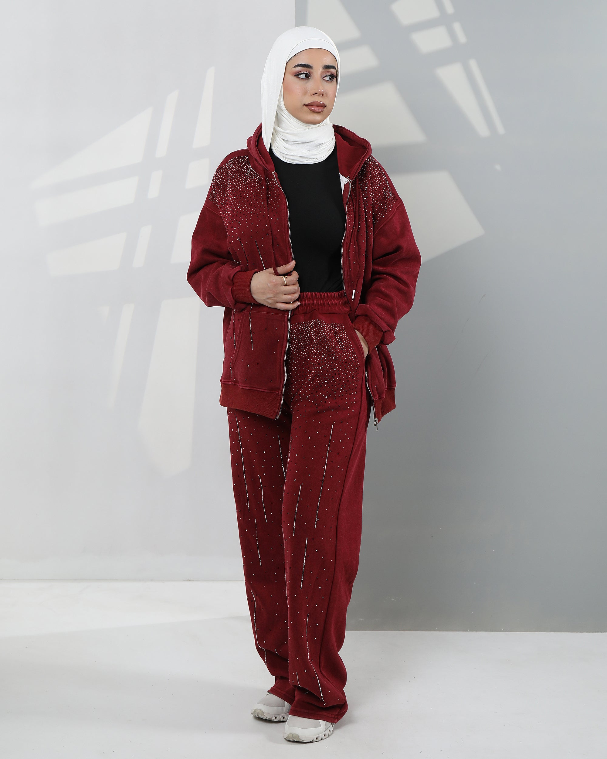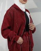 Embellished Velvet Hoodie Two-Piece Set – Deep Burgundy