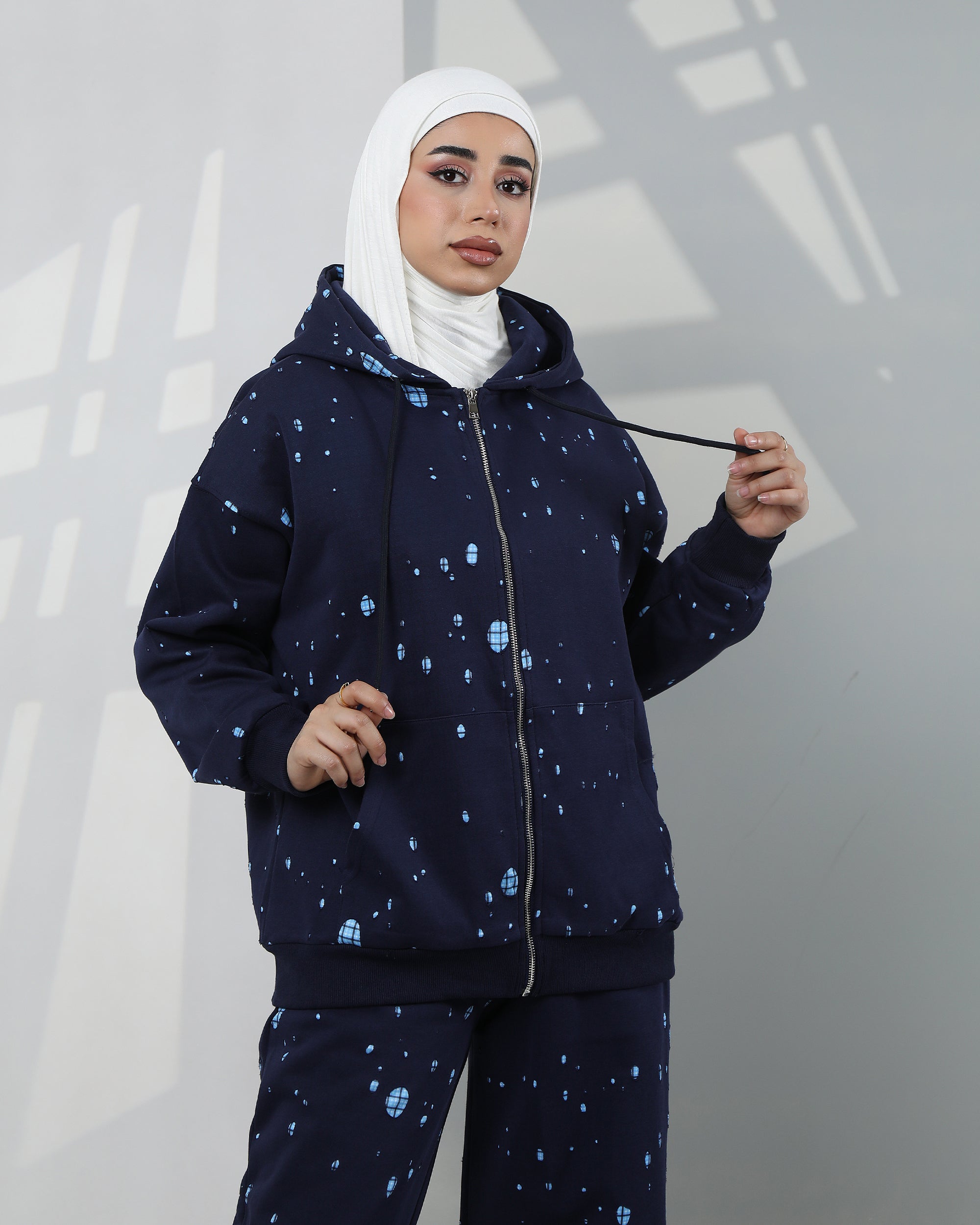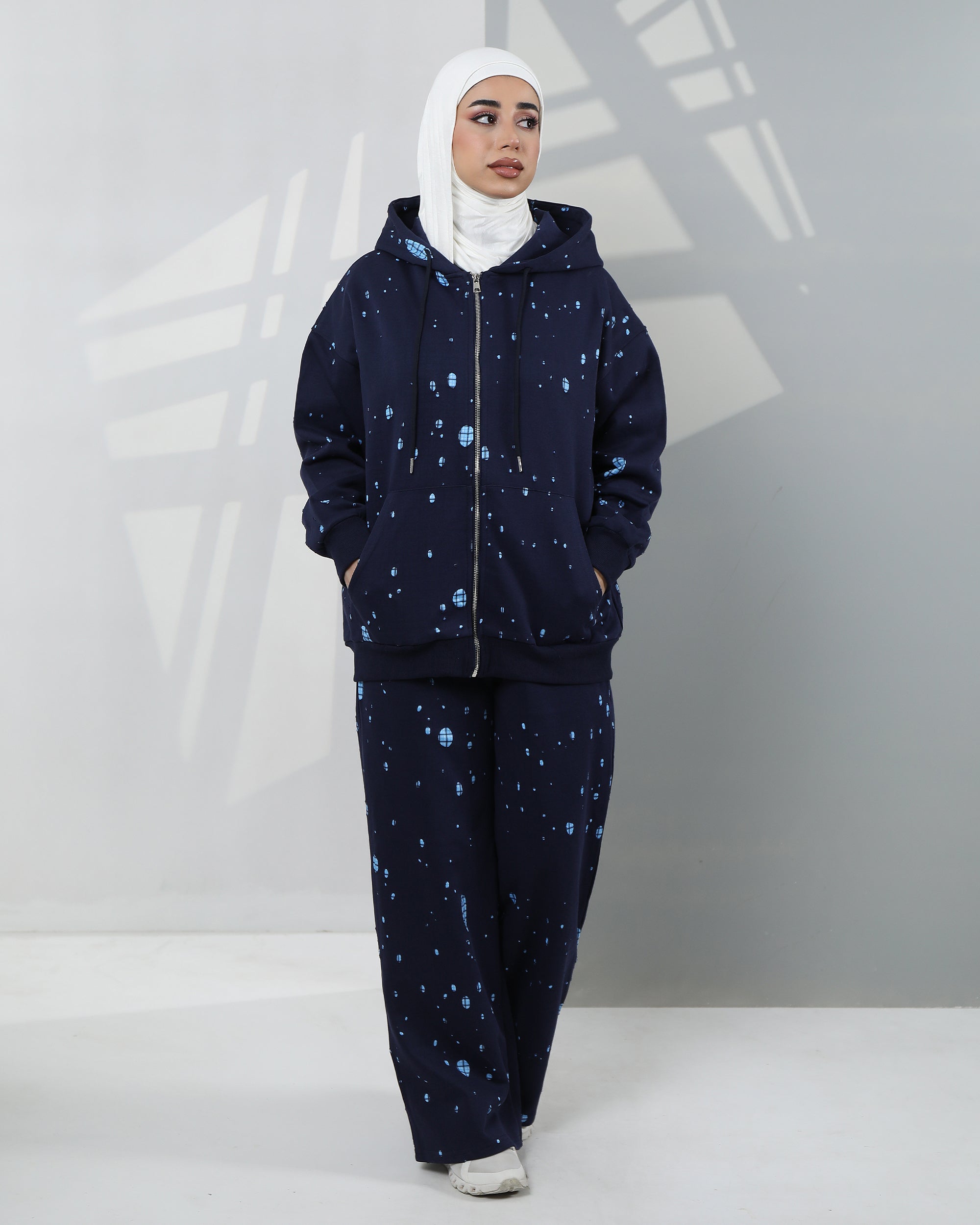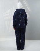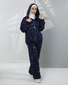Printed Velvet Hoodie Two-Piece Set – Navy Blue